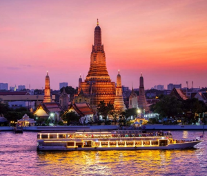 Dạo thuyền trên dòng sông huyền thoại Chao Phraya: Con sông của các vị vua, nơi gắn liền với lịch sử của những vương triều hùng mạnh của đất nước Thái. Xuôi thuyền trên sông Chao Phraya, du khách sẽ được nghe giới thiệu về lịch sử, kiến trúc, văn hóa về những ngôi chùa, những cung điện dọc sát bên sông, ngắm nhìn chùa Bình Minh huyền bí.