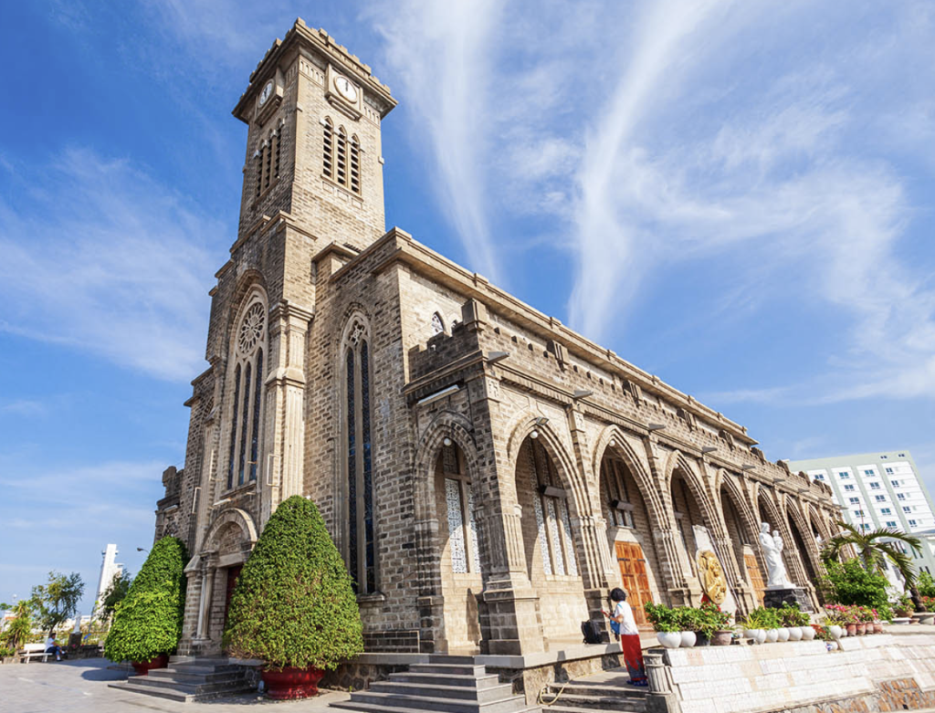 Nhà thờ Núi Nha Trang (Nhà thờ Chánh Tòa): Tọa lạc ngay trung tâm thành phố, được xây dựng trên đỉnh đồi cao với diện tích khoảng 4.500m², nhà thờ gây ấn tượng mạnh bởi kiến trúc đá cổ kính mang phong cách Gothic châu Âu. Những bức tường được xây bằng đá táp lô xi măng, mái vòm cao vút cùng ô cửa kính màu tạo nên vẻ đẹp vừa trang nghiêm vừa lãng mạn. Đây là điểm dừng chân lý tưởng để du khách check-in và cảm nhận nét cổ kính giữa lòng thành phố biển.